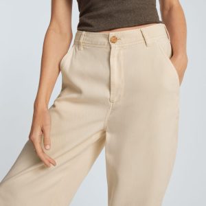 Our Chino in Buttersoft is a high-waisted pant crafted in a buttery soft. 100% TENCEL™ Lyocell fabric. It features a cool curved leg (similar to the Utility Barrel Pant) and asymmetrical back pockets: one with a button-back flap pocket and one with a slip pocket. These pants are slouchy. so if you want a slimmer fit. try sizing down.