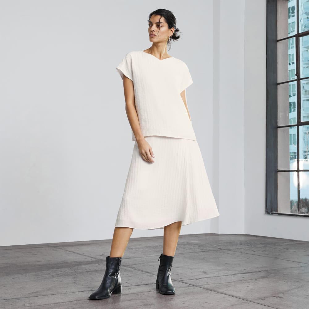 Featuring a high V-neck and cap sleeves in our new. softer. textured stripe viscose fabric. This classic style will get heavy closet rotation. This fabric has a heavier weight and is great for transitioning seasons. The viscose in this garment comes from an FSC-certified supplier who has been audited and assessed as being at low risk. or has taken substantive action to eliminate known risk of sourcing rayon and viscose from ancient and endangered forests by CanopyStyle. Made from post-consumer plastic bottles that are collected. washed. chopped. melted. and then made into polyester yarn. REPREVE® recycled polyester boasts less energy and water usage as well as reduced greenhouse gas emissions. when compared to virgin polyester and other conventional recycled plastic sources. The REPREVE® registration platform provides full supply chain visibility from source to product—ensuring the exact bottle count per product and source location of those bottles. To date. REPREVE® has saved over 30 billion plastic bottles from landfill.