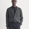 This piece features a V-neck. front button placket with horn-like buttons. chunky ribbed cuffs and hem. in 100% organic cotton.