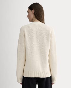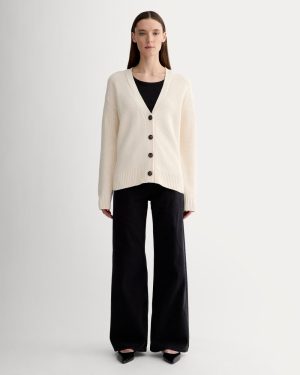 This piece features an easy relaxed fit. long sleeves. V-neck. button-front closure. and drop shoulders with a thick rib-stitched hem and neckline in 100% organic cotton.