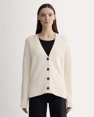 This piece features an easy relaxed fit. long sleeves. V-neck. button-front closure. and drop shoulders with a thick rib-stitched hem and neckline in 100% organic cotton.