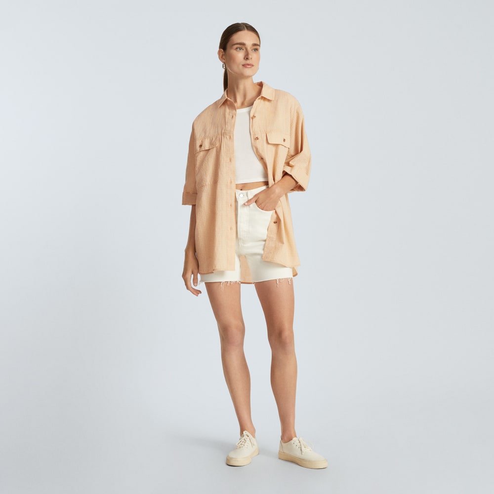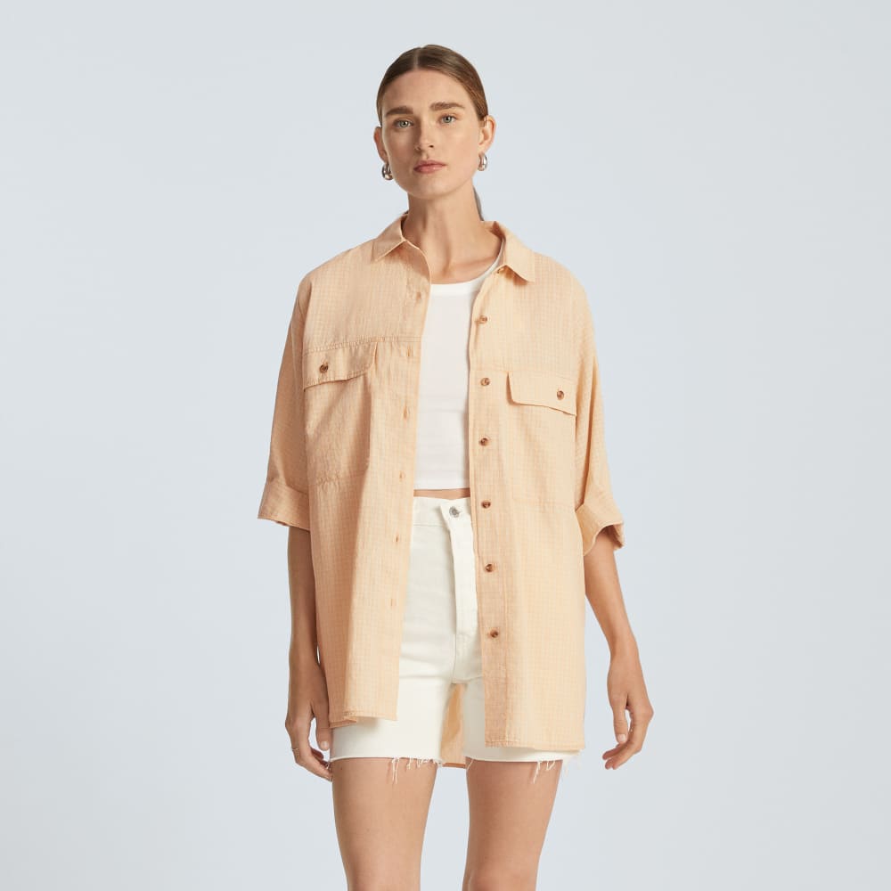 The Cotton Tourist Shirt is made of a cotton voile fabrication that’s soft. slightly sheer. and eye-catching thanks to its two-tone. plaid pattern weave and kimono sleeves. An easy. button-down shirt with a high-low hem designed for layering. so roll up the sleeves and tie it at the front for a loose. casual look that’s travel-ready.