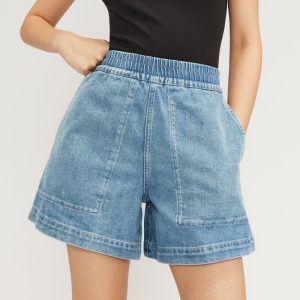Made of TENCEL™ Lyocell with REFIBRA™. The Denim Utility Short features an A-Line shaped style with a pull-on elasticated waistband. It features slash pockets with utility stitching details. a back patch pocket for a craftsman-inspired look. and a 5 inseam in our softest. most drapey denim. TENCEL™ Lyocell with REFIBRA™ technology has the softness. strength. and lower environmental impact of TENCEL™ Lyocell. while incorporating recycled materials. A man-made cellulosic material that uses both upcycled cotton textiles (up to 33%) as well as FSC-certified. sustainably sourced wood pulp. it boasts reduced water and energy usage (compared to conventional cotton) with the added benefit of circularity.