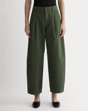This piece features a high rise. ankle length. barrel leg. with front angled pockets. back welt pockets. front and back darts for shape. zip fly. in organic cotton with a touch of linen.