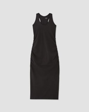 This piece features a scoop neck. racer back. fitted silhouette. midi length with a straight skirt and soft ruching effect at side seams. in Supima® Form fabric.
