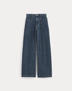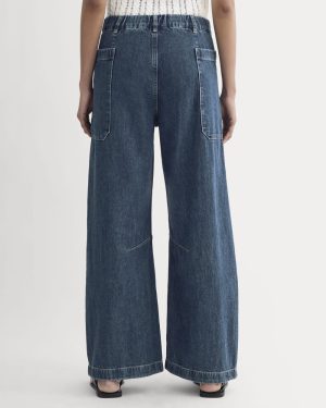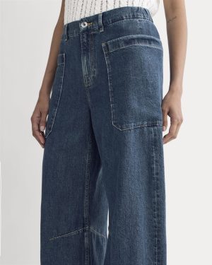 In a mid-weight drapey denim blend. this pant features a high rise. relaxed-fit leg. oversized patch pockets on the thighs. and an elastic waistband for practicality and comfort. Finished with contrast stitching. it offers a utilitarian look with everyday ease.