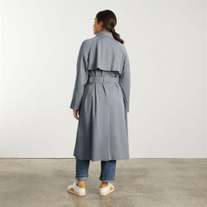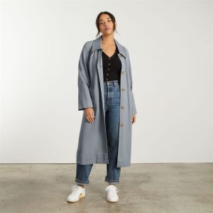 It features storm flaps. gathered detail at the shoulders. and a high back slit. Wear it with a belt for a more fitted look or alone for a loose A-line silhouette.