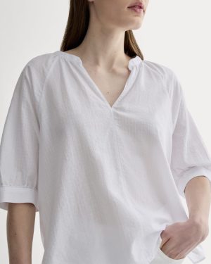 A lightweight textured organic cotton gauze gives this relaxed V-neck. short-sleeve blouse an airy feel with just the right amount of shape. Throw it on over shorts or a shirt for a lunch date or add wide-leg pants for work.