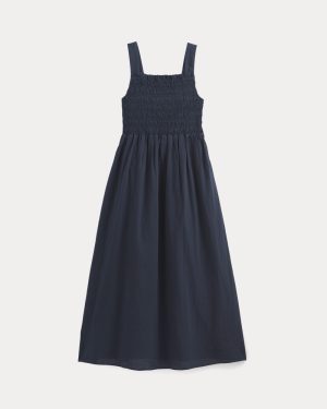 This piece features a smocked bodice. square neckline. fit-and-flare silhouette. midi length. bra-friendly straps. on seam side pockets. full lining. in an airy organic cotton.