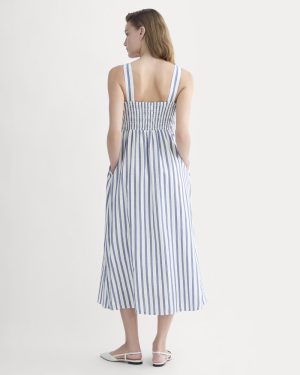 This piece features a smocked bodice. square neckline. fit-and-flare silhouette. midi length. bra-friendly straps. on seam side pockets. full lining. in an airy organic cotton.