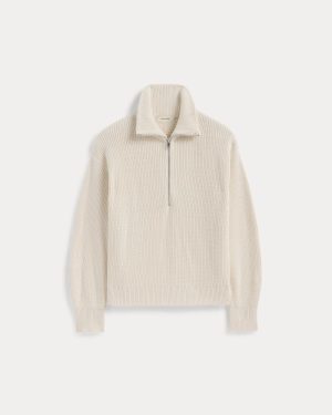 This piece features an elevated zip neckline. a chunky ribbed knit. and a relaxed fit. in 100% organic cotton.