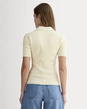 Perfect for now. Perfect for later. Featuring a slim fit. ribbed knit. short sleeves. and cropped polo crew neck. it combines the softness of cotton with the slink of Naia™ Renew recycled viscose. Pair this with our signature Way-High® denim and mules for a classic look.