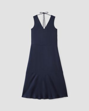 This piece features a relaxed fit. sleeveless silhouette. V-neck with back neck tie. dropped waist with a slightly fitted look. side pockets. hidden zipper at side seam. and maxi length.