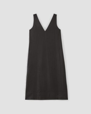This piece features a relaxed fit. slightly waisted midi length. with a V-neck in front and back. front and back seaming details. on seam pockets. and made from 100% European Flax™ Linen.