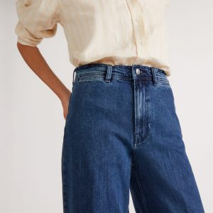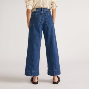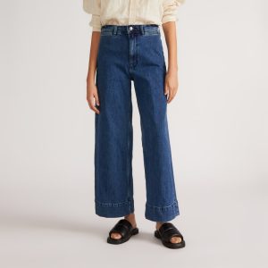 Made from low-stretch regenerative cotton. it features our signature Way-High waist. a wide leg silhouette. unique back patch pockets and detailed hems. Everyone needs a fancy pair of denim jeans—these are definitely it. These jeans run as a regular length. hitting or falling over the foot depending on your height.