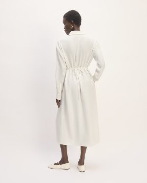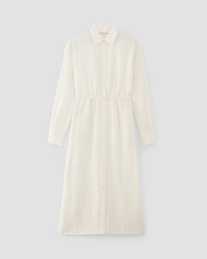 This piece features a midi length. button closure. collar. gathered waist with adjustable back-tie for a relaxed or waisted fit. full-length sleeves with cuffs. and on-seam side pockets. in FSC-certified viscose and recycled polyester.
