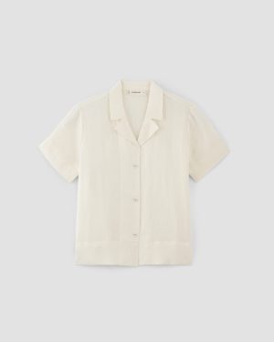This piece features a relaxed fit. short sleeve. notch collar. and button closure. in linen.