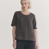 This piece features a relaxed fit. short sleeve. notch collar. and button closure. in linen.