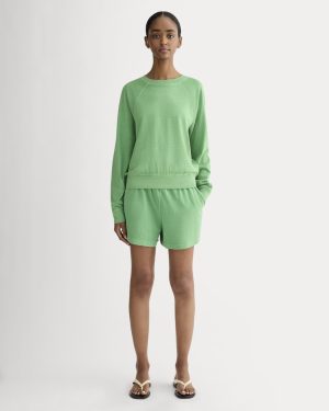This piece features a relaxed fit. crew neckline. long. raglan sleeves. in premium weight 100% organic cotton jersey.