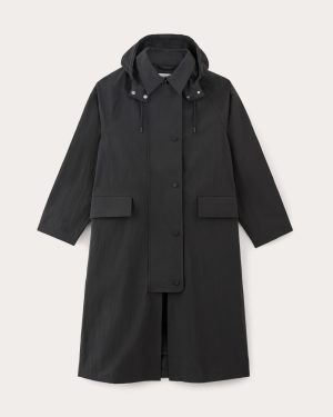 This piece features a spacious hood. a zippered front. easy snap closures. front flap pockets long-length silhouette. and water-resistant.