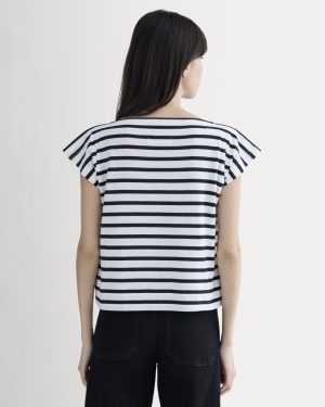 This oversized muscle style features a wide boat neckline and a boxy fit. Front and back dart seams create a subtle sculpted shape. Easy and versatile to style with everything. try barrel jeans. pleated shorts. or a column skirt to reflect those clean lines.