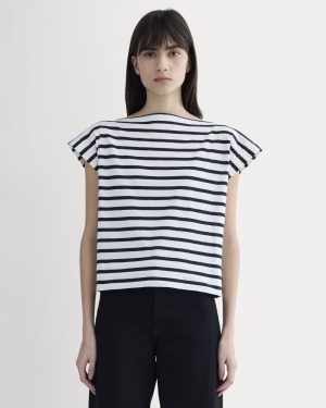 This oversized muscle style features a wide boat neckline and a boxy fit. Front and back dart seams create a subtle sculpted shape. Easy and versatile to style with everything. try barrel jeans. pleated shorts. or a column skirt to reflect those clean lines.