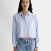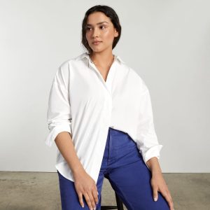 The Oversized Poplin Shirt adds instant polish to any look. A half-placket and dropped shoulders give it a refined feel that goes easily with denim. Cotton poplin is densely woven. making it both durable and breathable. also giving it a crisp. cool feel.