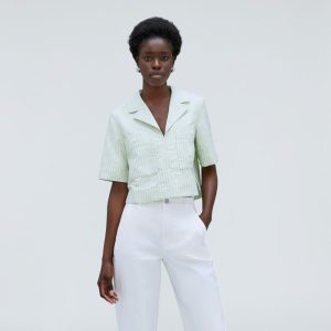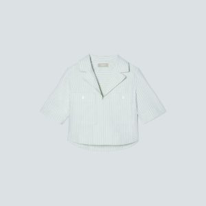 In a cropped. boxy popover fit. The Oxford Popover. features wide lapels and a v-neckline. with two utility style front pockets. Wide short sleeves balance the midriff-skimming hem. Made with our much-loved 100% organic cotton Oxford fabric. it’s perfect to pair with high-waist pants and denim.