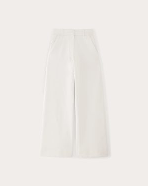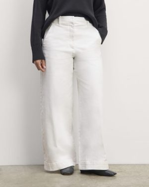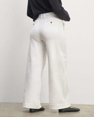 This piece features a wide leg. high rise. front angled pockets. and back welt pockets with button closure. in organic cotton.