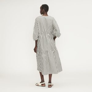 Add instant polish to your day with The Poplin Tiered Dress. A maxi-length dress. it features gathered tiers at the bust and just below the waist. creating a relaxed. oversized A-line silhouette. It has a V-neckline and 3/4 length sleeves with a subtle balloon shape. and side pockets. It’s made with 100% cotton to keep things light and breezy. Cotton poplin is densely woven. making it both durable and breathable. also giving it a crisp. cool feel.