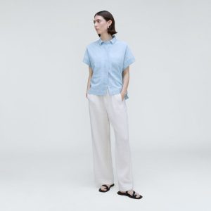 Lightweight and cooling. The Rechambray Box Shirt is made from an organic and recycled cotton blend and features a notched collar. a clean button front. relaxed short sleeves. utility-inspired patch pockets. and a boxy shape. Wear it tucked into any of our denim for an instantly cool look.
