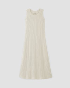 This piece features an A-line silhouette. midi length. crew neck. sleeveless. relaxed fit. and ribbed texture. in organic cotton and LENZING™ ECOVERO™ viscose.