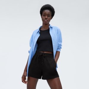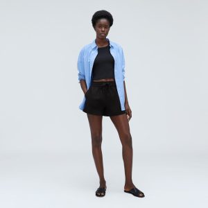 Made of a light. airy organic seersucker cotton. meet The Seersucker Boxer Short. Featuring a high-rise. pull-on elastic waistband with tie-detail. in an A-line silhouette. great the summer heat in style with these easy shorts.