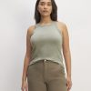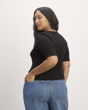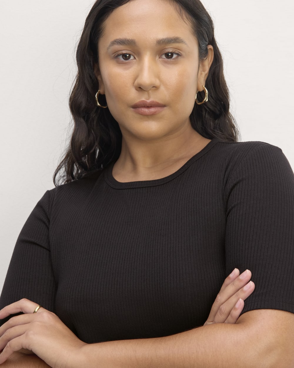 This piece features a crew neck. cropped silhouette. short sleeves. in our ribbed Shimmy fabric that offers an elevated softness and subtle sheen.