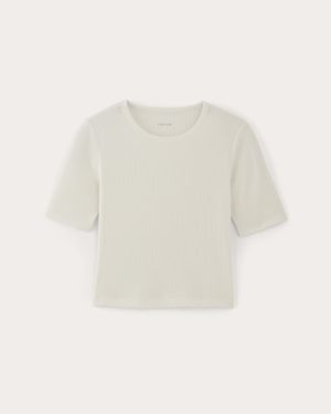 This piece features a crew neck. cropped silhouette. short sleeves. in our ribbed Shimmy fabric that offers an elevated softness and subtle sheen.