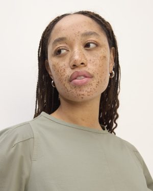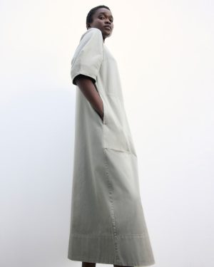 This piece features a relaxed A-line silhouette. midi length. with a crew neck. ballooned short sleeves. on seam pockets with utility top stitch details. and is made of a blend of 98% organic cotton. and 2% elastane.
