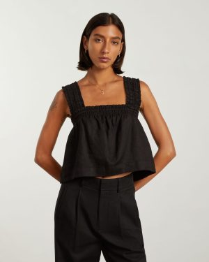 The Smocked Linen Cami has ultra-feminine features like a ruffled neckline and sleeves with a billowy shape that pairs perfectly with any high-rise bottom. Plus. it’s made of 100% linen which makes it more wrinkle resistant. extra breathable. and ideal for warm-weather days.