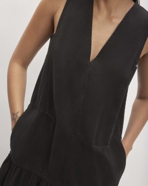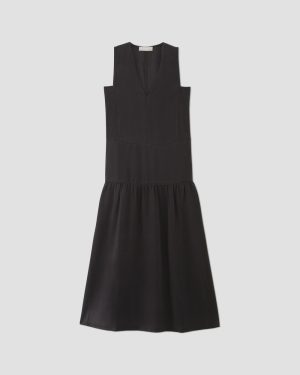 The TENCEL™ V-Neck Dress plays to chic minimalism with a little extra flair. In a relaxed fit. this sleeveless dress has a deep V-neckline. dropped waist panel. with side panels for gentle structure. plus on-seam pockets. Made with our buttery soft TENCEL™ Lyocell for that touch of polish. Known for its lightness and versatility. TENCEL™ Lyocell is a man-made cellulosic fiber extracted from PEFC and FSC-certified responsible wood sources. It offers the same exceptional softness as conventional cotton while using less energy and water in the production process.