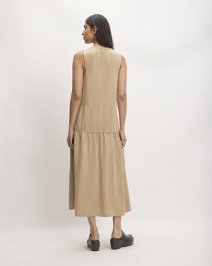The TENCEL™ V-Neck Dress plays to chic minimalism with a little extra flair. In a relaxed fit. this sleeveless dress has a deep V-neckline. dropped waist panel. with side panels for gentle structure. plus on-seam pockets. Made with our buttery soft TENCEL™ Lyocell for that touch of polish. Known for its lightness and versatility. TENCEL™ Lyocell is a man-made cellulosic fiber extracted from PEFC and FSC-certified responsible wood sources. It offers the same exceptional softness as conventional cotton while using less energy and water in the production process.