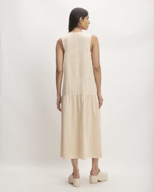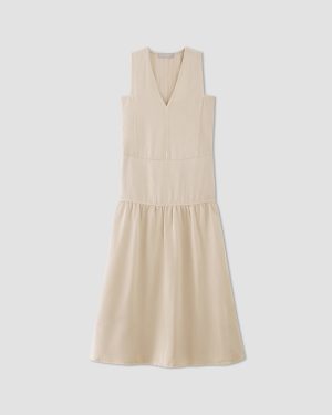 The TENCEL™ V-Neck Dress plays to chic minimalism with a little extra flair. In a relaxed fit. this sleeveless dress has a deep V-neckline. dropped waist panel. with side panels for gentle structure. plus on-seam pockets. Made with our buttery soft TENCEL™ Lyocell for that touch of polish. Known for its lightness and versatility. TENCEL™ Lyocell is a man-made cellulosic fiber extracted from PEFC and FSC-certified responsible wood sources. It offers the same exceptional softness as conventional cotton while using less energy and water in the production process.