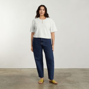 The Vintage Henley Hemp Tee features elongated short sleeves for a throwback twist and a cropped. boxy fit. It’s made of hemp. which is an incredibly strong fiber that’s longer lasting. with a lower environmental impact.